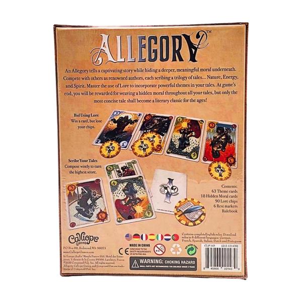 In Allegory, you are a mythic author. Bid using lore chips to collect theme cards to craft their your tales (Nature, Energy, and Spirit). In the end, you score only the tale with the lowest total value. Enhance your score by including sets of themes throughout your trilogy. Earn bonus points for including your moral in each tale. The player with most points has scribed a classic tale and mastered the allegory!