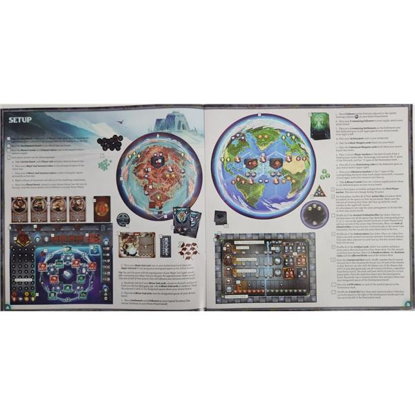 In addition to having a strong dose of controllability (the luck factor is minimal), the game features an innovative starred action-selection-system that confronts players with interesting choices: players can reincarnate their gods by performing their actions in a precise sequence, on pre-established paths of their starred player board, or they can give up some deities, jumping freely from one action to another of their board, to choose from time to time the situationally best actions.