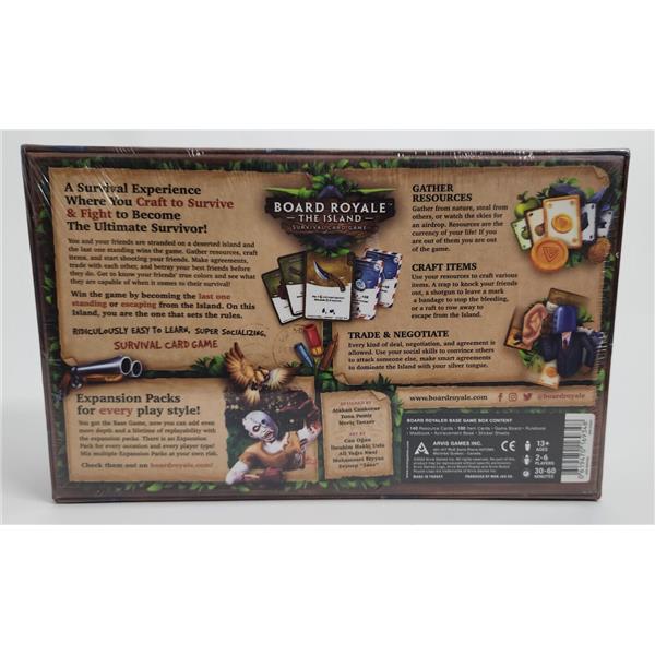 BOARD ROYALE is a turn-based survival card game for 2 to 6 players. To survive, you will have to be sneaky and a ruthless backstabber. BEWARE: Board Royale can be a friendship breaker! The goal of the game is to survive by any means necessary. If a player runs out of resources, they are instantly eliminated from the game! The last man standing on the island or the first to escape by collecting 10 escape points, wins the game. This is not an easy task!