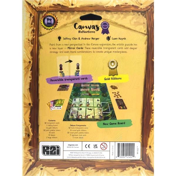 Paint from a new perspective! In Canvas: Reflections, the artistic puzzle has a new layer -- Mirror Cards! These reversible cards add deeper strategy, and also give you increased flexibility to string together combinations of Elements. Additionally, the new board offers a wider selection of Art Cards that allows you to better plan ahead and presents more choices even when running low on Inspiration Tokens.