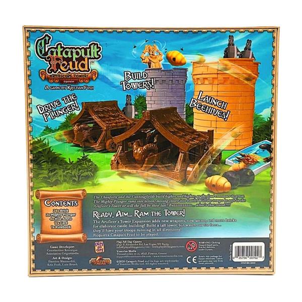 Catapult Feud: Artificer's Tower Expansion includes a new weapon (the Mighty Plunger), new Action cards, new ammunition (bee hives!!) and bricks to help you build the Artificer’s Tower!