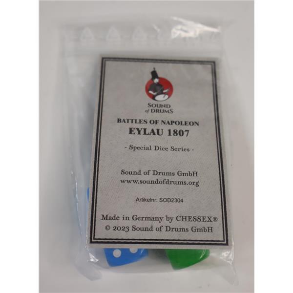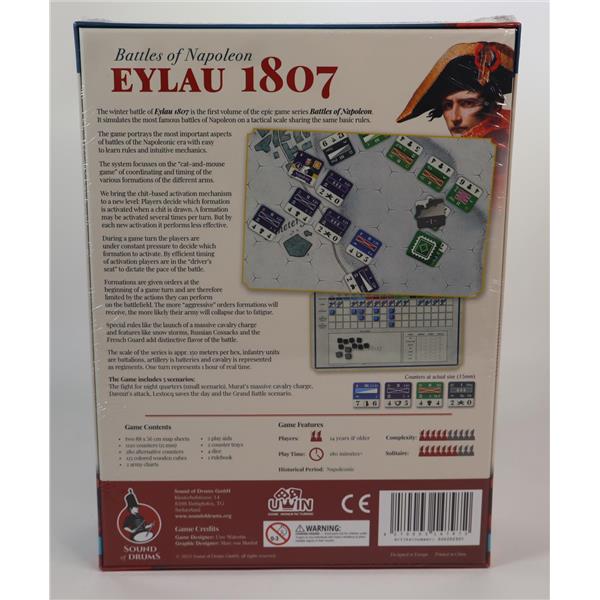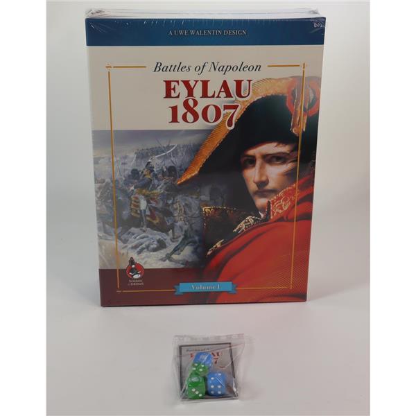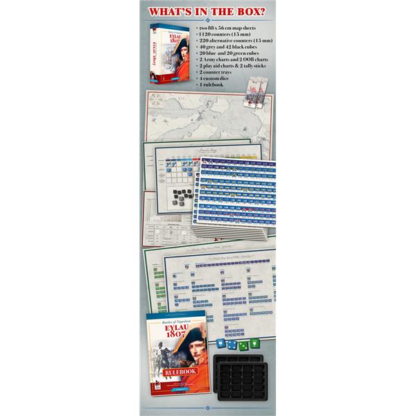 EYLAU 1807 contains 1120 large (15mm) counters, 280 alternative counters, 2 huge map sheets (each 86 x 55 cm) with large hexes, 4 charts and tables, 125 wooden cubes, 2 counter trays, 1 rules manual and 4 customized dice.