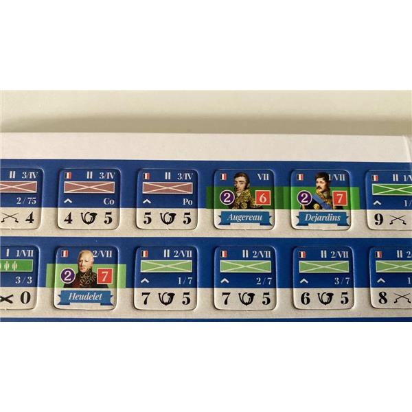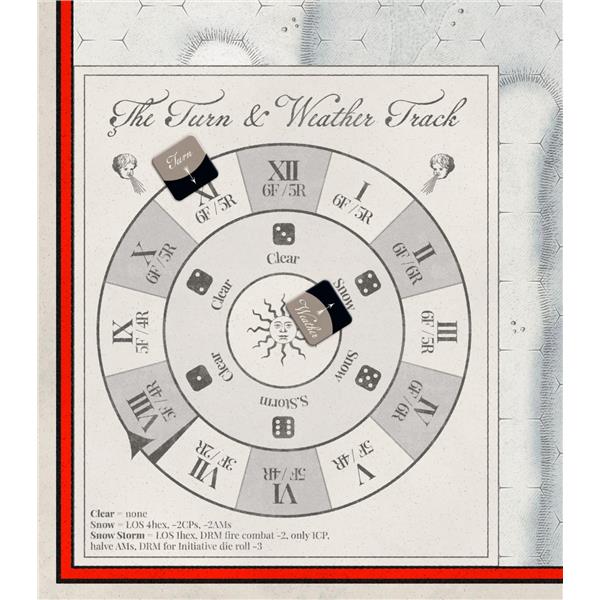 Thanks to the successful funding on Gamefound and the unlocked stretch goals the components of the game are upgraded: the dice are customized and the charts and tables are deluxe (printed on 2mm grey carton) and the game includes 280 alternative counters.