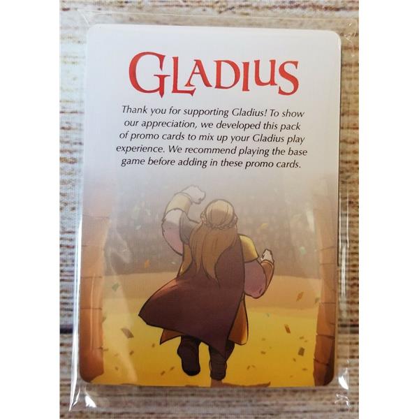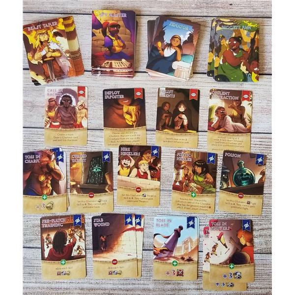 Draw a random event card to determine how many gladiators will compete and what skill(s) the event is judged on. Each gladiator has varying levels of Fight ?? , Theatrics ?, and Luck ? that can be buffed or nerfed throughout the game.