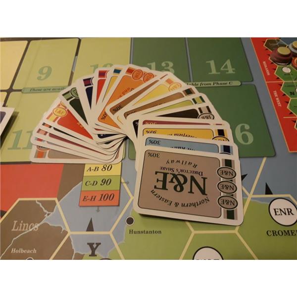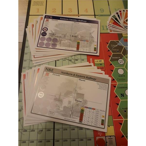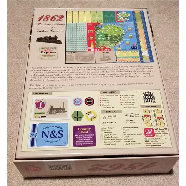 1862: Railway Mania in the Eastern Counties is set in this cauldron of railway construction. Players will vie to start railway companies, invest money in railway shares, and attempt to run the railways they control for personal gain, trying to keep them afloat in changeable economic times. Each game played will be unique. Out of 20 available railway companies, only 16 will be randomly selected for each game - and only eight will be available at start. Each company also starts with a randomly chosen Permit to run one of three different types of train. Players then begin the game by investing in some of the available companies. Each company will generate revenue for the majority shareholder by laying track on the board, placing station markers, running any trains it owns, paying dividends or retaining revenue from those trains, and then buying more and more advanced trains. As the game progresses, players can start more companies and can merge companies they control with other companies. When larger and more powerful trains are bought, older trains become obsolete and disappear, causing financial crisis for the unprepared. The game ends after the last band of trains is bought, and the wealthiest player, including shares, but not money in companies, is the winner.