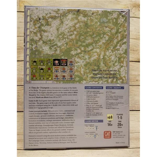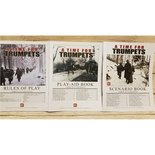 A Time for Trumpets (ATFT) is a battalion level game of the Battle of the Bulge. The game system incorporates a number of concepts from two the highly playable games on the same subject: Bitter Woods by The Avalon Hill Game Company and the iconic battalion level Wacht am Rhein from SPI in 1977. In addition, the command and control concepts devised for the TAHGC version of The Siege of Jerusalem were utilized.