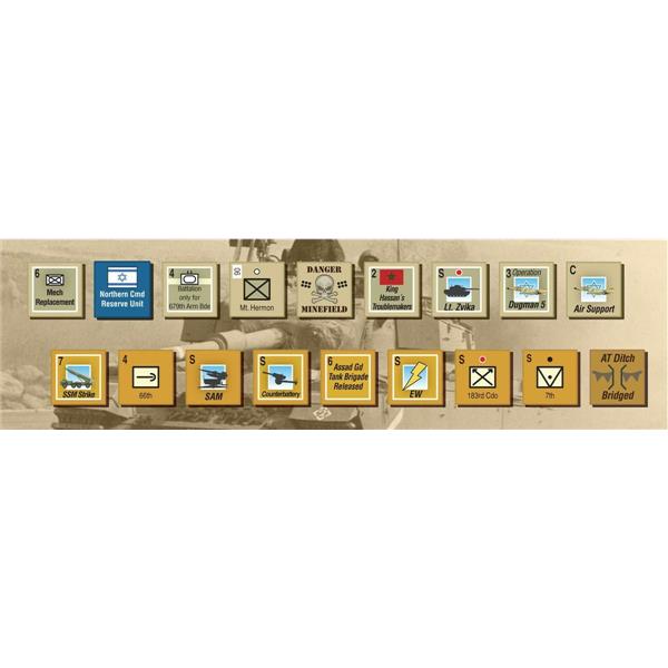 The Israelis start with few units but gain strength as reinforcements arrive, but will there be enough and will they get there in time? The Syrian player starts with a very strong force, but must attack at the right places and rely on rapid breakthrough across the Golan Heights in order to seize the objectives. Time is against the Syrians, with not only the Israeli reserves arriving, but also as the SAM barrier gets reduced and the effectiveness of the Israeli Air Force grows. The Syrians must strike hard and fast, then fight to hold on to their gains.