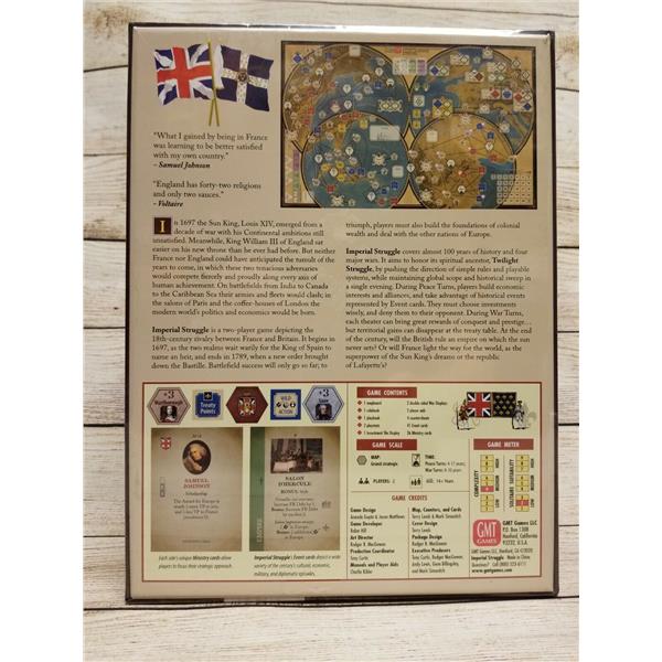 Imperial Struggle is a two-player game depicting the 18th-century rivalry between France and Britain. It begins in 1697, as the two realms wait warily for the King of Spain to name an heir, and ends in 1789, when a new order brought down the Bastille. The game is not merely about war: both France and Britain must build the foundations of colonial wealth, deal with the other nations of Europe, and compete for glory across the span of human endeavor.