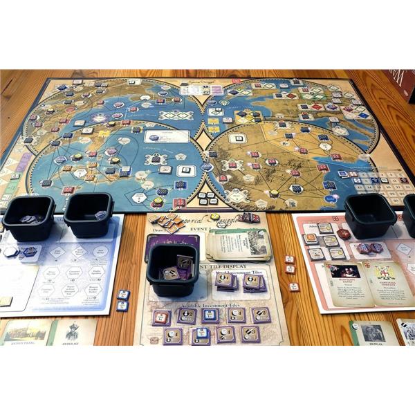 Imperial Struggle is a low-complexity game that can be finished by experienced players in a short evening. It is not a card-driven game in the sense that cards do not determine the entire scope of player actions each turn; rather, players must combine the Investment Tiles, accessible to each of them, with the Events, which are secretly held. Additionally, Imperial Struggle has no die rolling. The randomness in the game comes from three sources: the Investment Tile deal each peace turn, the initial military strength in each theater of war, and each player's Event draws.