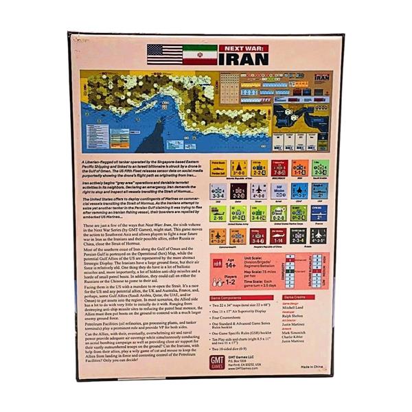 Next War: Iran is the sixth game in the Next War series. It is unique in the series in that the Allied player has to do the attacking while the non-Allied player attempts to defend its territory against neo-imperial oppression. With a long logistical tail, few true allies in the region, and the menace of Iran's A2AD capabilities, re-opening the Straits is a tall order.
