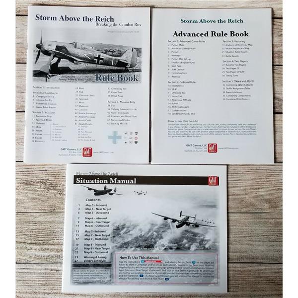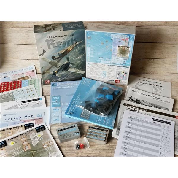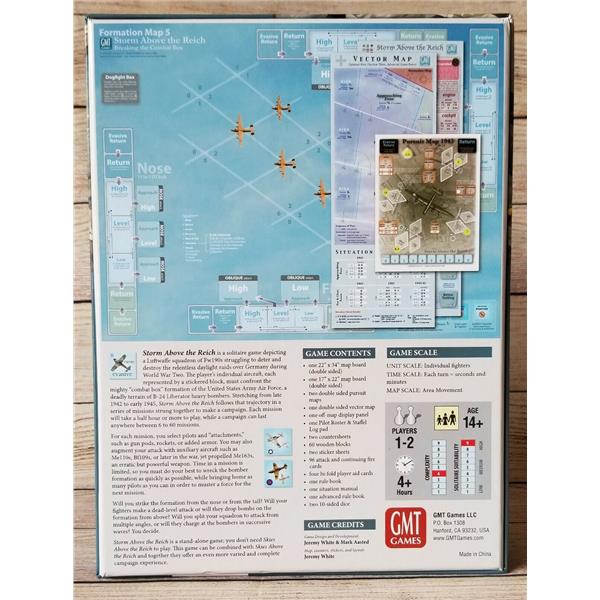 Storm Above the Reich is a solitaire game depicting a Luftwaffe squadron of Fw190s struggling to deter and destroy the relentless daylight raids over Germany during World War Two. The player's individual aircraft, each represented by a stickered block, must confront the mighty "combat box" formation of the United States Army Air Force, a deadly terrain of B-24 Liberator heavy bombers. Like its counterpart, Skies Above the Reich, the game is a broad strokes depiction that presents the arc of the desperate air war. Stretching from late 1942 to early 1945, Storm Above the Reich follows that trajectory in a series of missions strung together to make a campaign. Each mission will take a half hour or more to play, while a campaign can last anywhere between 6 to 60 missions.