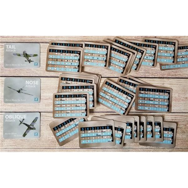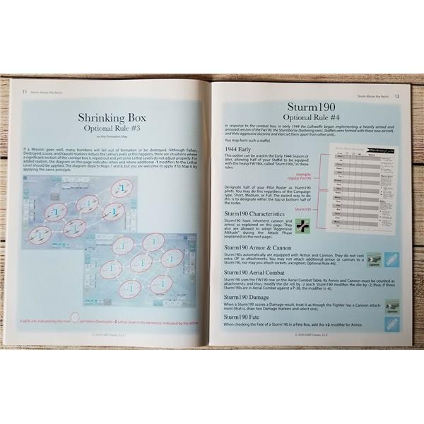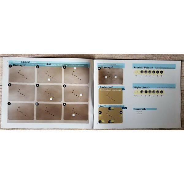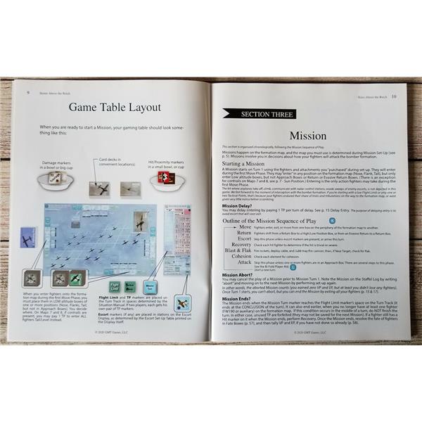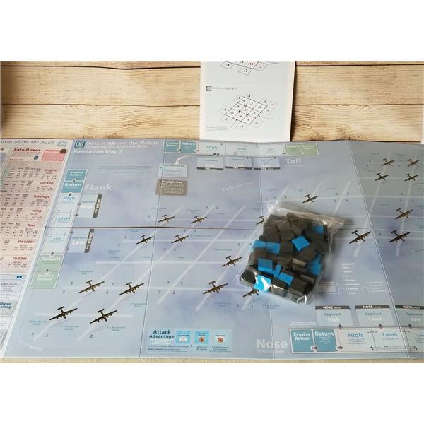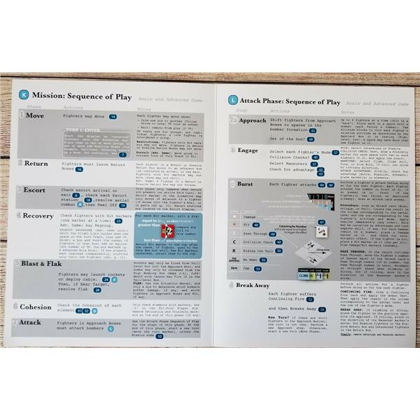 Basic and Advanced Games: In the basic game, your goal is to knock bombers out of formation, or destroy them outright. The advanced game adds "pursuit" where you dispatch fighters to chase after and intercept bombers knocked out of the formation. Played out on an 8.5" x 11" map depicting a single bomber, pursuit makes the advanced game even more challenging.