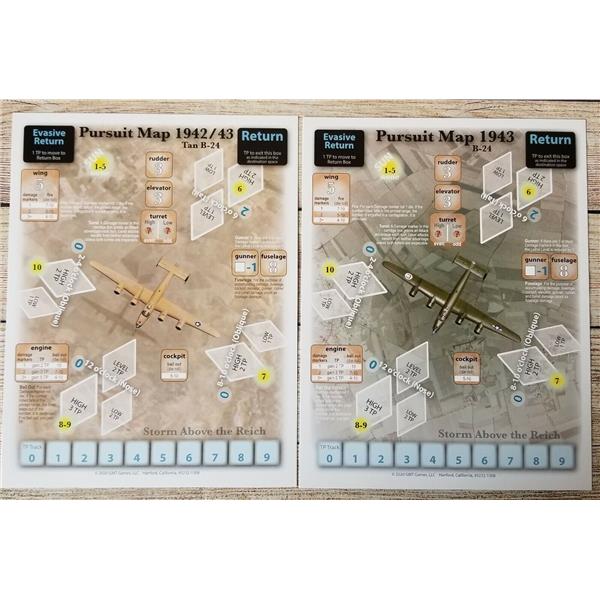 The mission is played on a formation map that depicts as many as twenty-one B-24 bombers in a tight array. The game comes with two double-sided map boards (four maps in all) that as a set chronicle the development and increasing lethality of the bomber formation. Each map is a bigger and more lethal terrain than its predecessor.