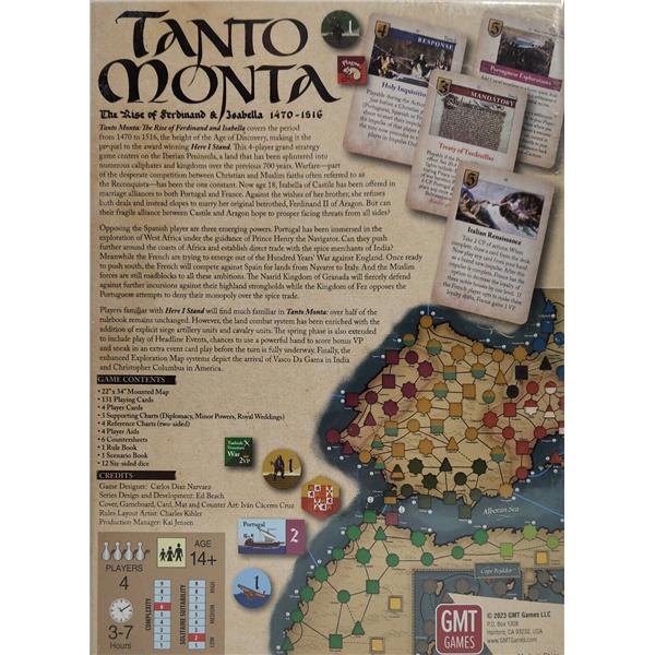 New Features: Tanto Monta introduces several innovations to the game series. The land combat system is enriched with the addition of explicit siege artillery units and cavalry units for all major powers, which can try to turn the tide in battle by making a dedicated cavalry charge. The spring phase is also extended to include play of Headline Events, chances to use a powerful hand to score bonus VP and sneak in an extra event card play before the turn is fully underway. Finally, the enhanced Exploration Map systems depict the arrival of Vasco Da Gama in India and Christopher Columbus in America and include explicit rolls to try and navigate into the Terra Incognita.