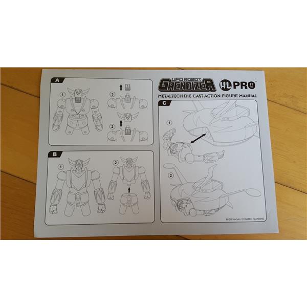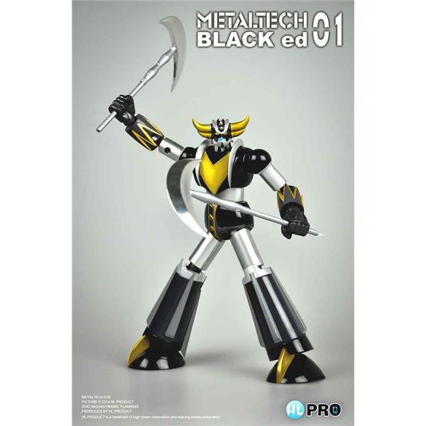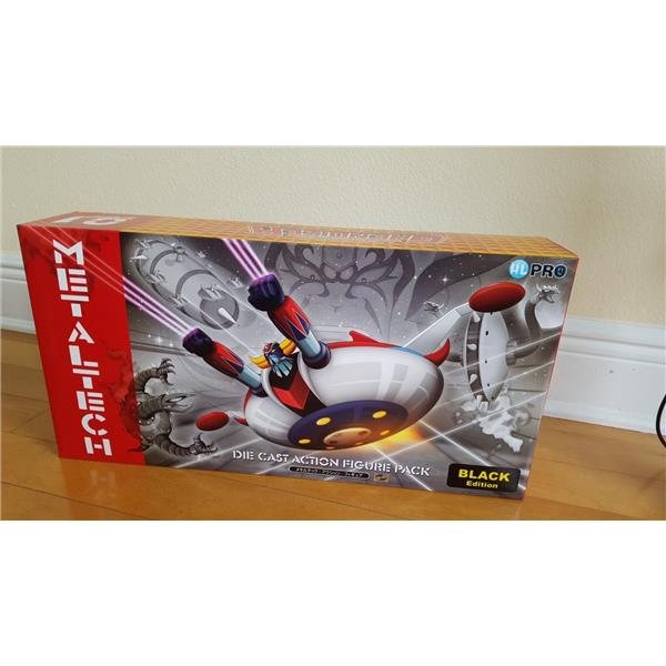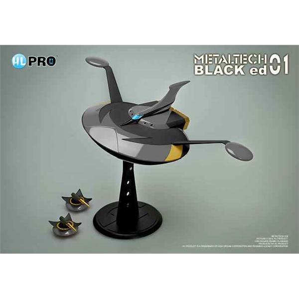 The box includes a METALTECH01 die cast action figure with 4 accessories, a ball jointed base, a metaltech01B+ die cast spaizer (spaceship) and 2 wing accessories.