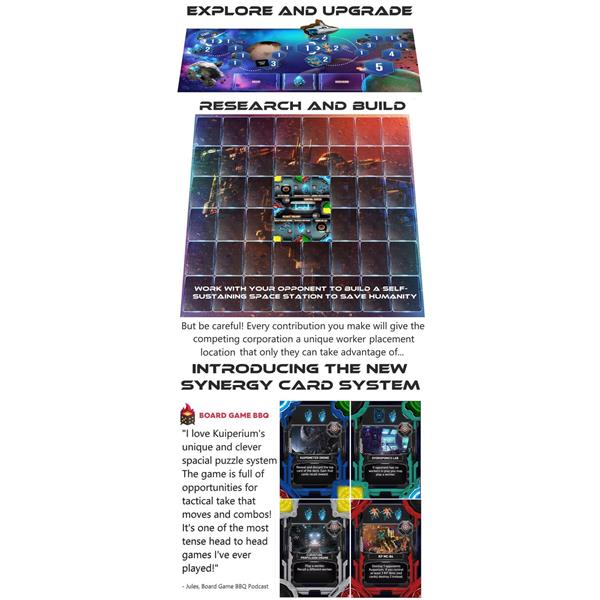 Kuiperium is a two player scifi themed game where you'll take the role of a corporation building a space station along the Kuiper asteroid belt with the goal of mining "Kuiperium". Kuiperium is a newly discovered element and is incredibly valuable. Race against your opponent to gain control of the space station, mine the most kuiperium, and ultimately launch towards new frontiers.