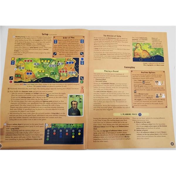 In La Famiglia: The Great Mafia War, you play against each other in teams (2 vs. 2) to take control of Sicily. Six different mafia families, each with special abilities, are at your disposal. The game rounds are divided into two phases: In the planning phase, you develop your abilities and bring fighters as well as secret orders to the board. In the combat phase, these orders are revealed and executed. Here, you use your fighters and bombs to dominate as many regions as possible. The combat system is both simple and innovative, making every fight an exciting psychological duel. The team that best combines and coordinates its abilities will finally dominate Sicily.