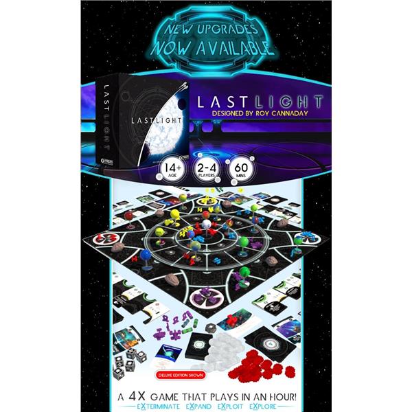 Last Light Deluxe Edition Board Game plus Infinity Expansion by Grey Fox Games: Includes core game, Infinity Expansion, 40 additional Ship miniatures (3 different sizes for 4 players), 32 additional resource extractor miniatures (8 in each player color), 60 additional Upgraded 2 color resource canisters, 12 Additional planets and stands, Additional Upgraded Light tokens, Additional Upgraded Acrylic Damage tokens, and all other unlocked stretch goals.