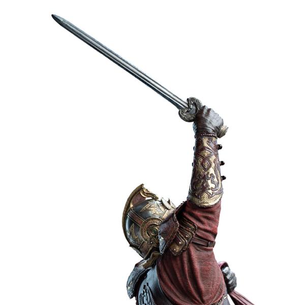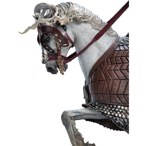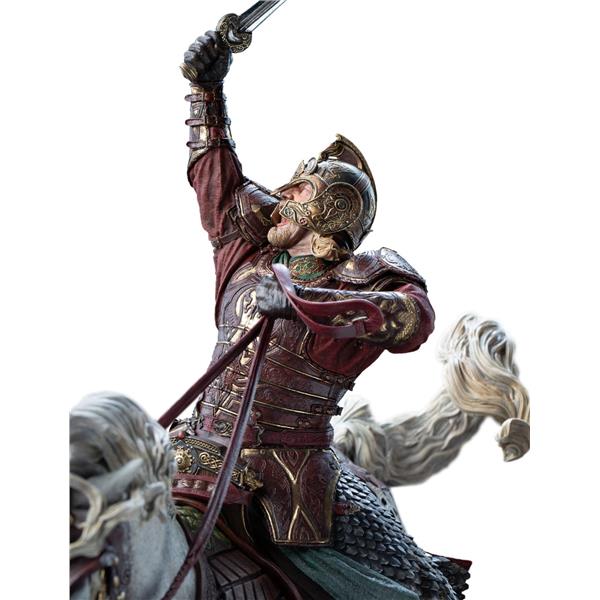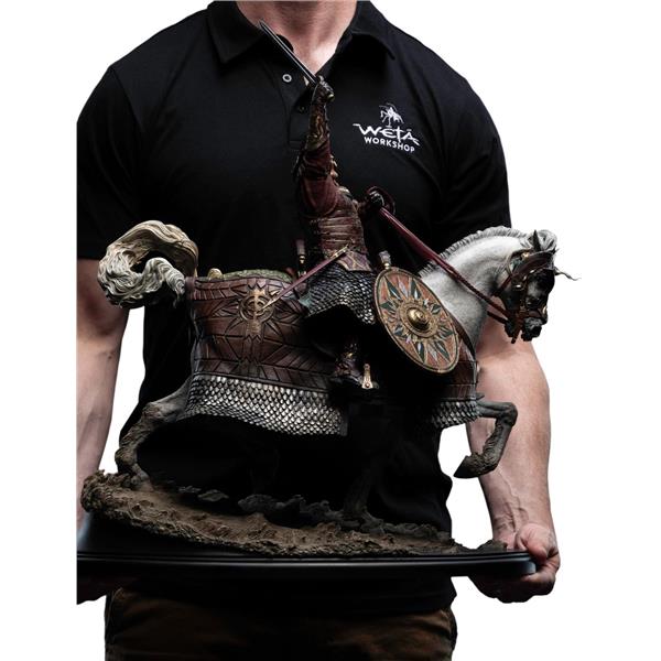 "This penultimate moment of majesty has been faithfully recreated here as a stunning sculptural masterpiece. Senior sculptor Mauro Santini worked wonders into every element of this collectible, from the imposing weight of the warhorse Snowmane™, about to burst forth with righteous fury, to the finely detailed leather armour of King Théoden, accented with brass plating and built for battle.