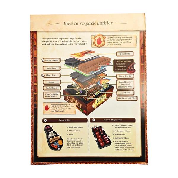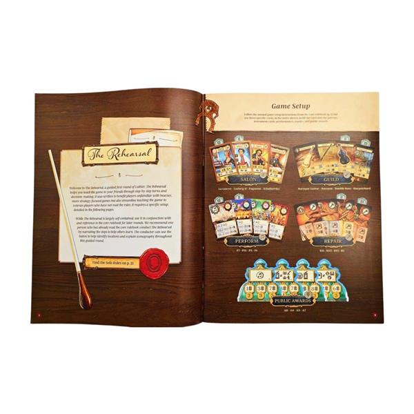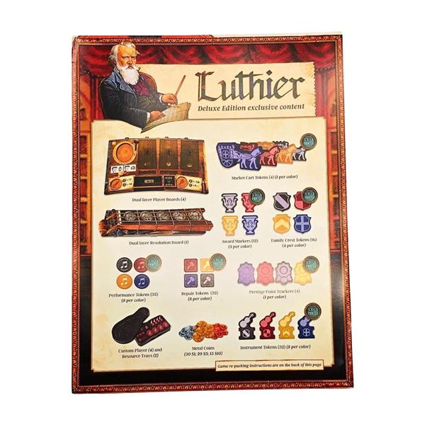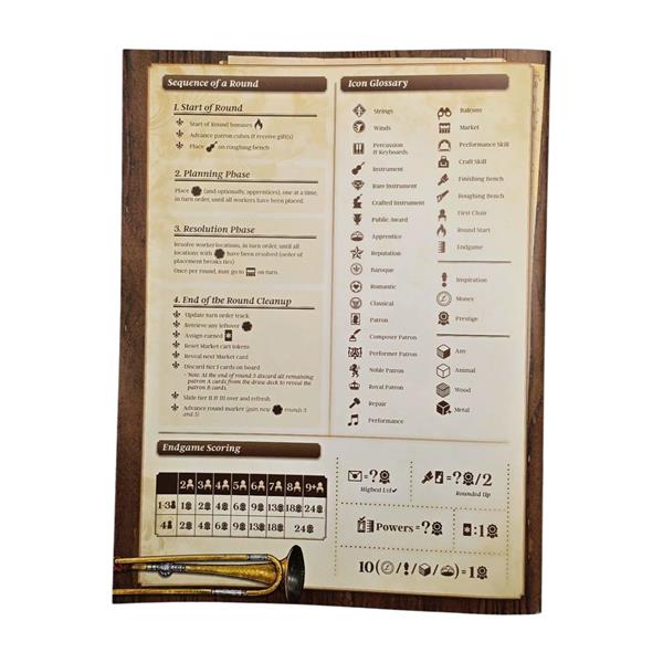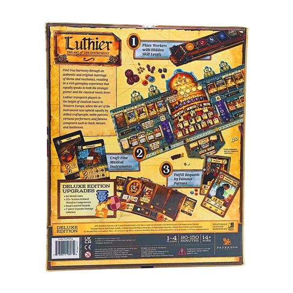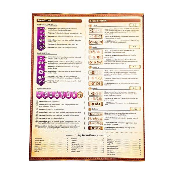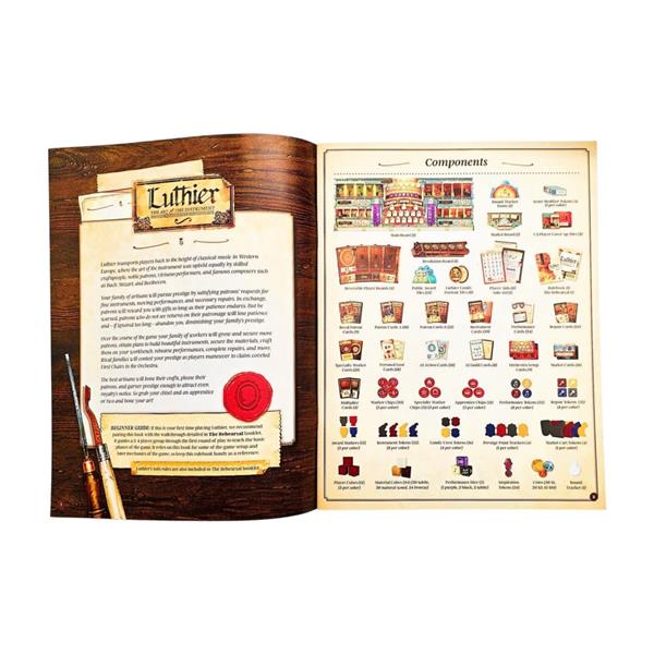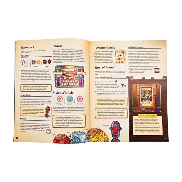 Using a new, unique combination of hidden bidding and worker placement, players manage resources to craft various musical instruments in their workshop, while also courting actual historic patrons through an ever-changing personal tableau of actions and bonuses. Each player chooses how to balance improving skills across multiple tracks, unlocking specialized worker abilities and other bonuses. The choice to concentrate on varying gameplay strategies and goals, such as musical performances, instrument building and repairs, apprentice training and workshop expansion, and overall reputation as an instrument maker, provide multiple paths to victory.