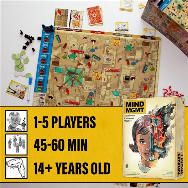 In Mind MGMT: The Psychic Espionage "Game.", one player controls Mind MGMT and must scour the city for new recruits. They move around on a secret map, trying to visit locations that match one of their three randomly drawn feature cards. They can also use their four Immortals to protect locations from being exposed.