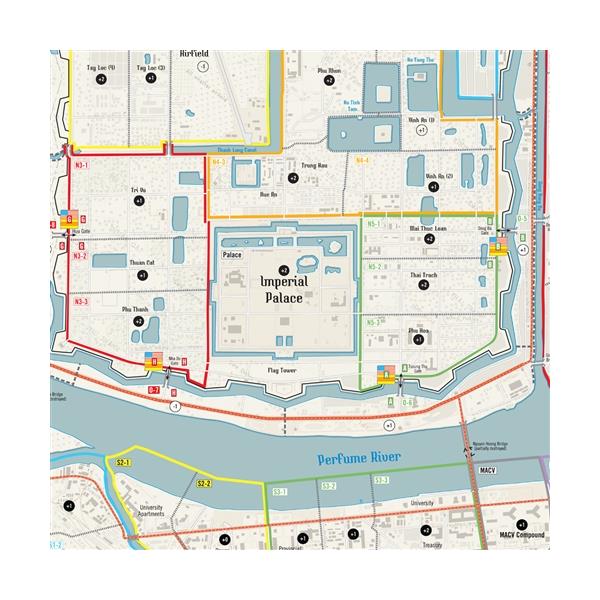 Block by Block is a two-player conflict simulation of the 1968 Battle of Huế. Players must balance the military difficulties imposed by the challenges of constrained urban warfare and unique terrain of the Huế Citadel, with the overriding considerations of each side’s respective political goals. The North Vietnamese player must hold the city for as long as possible, to create a media event and lay the groundwork for a new revolutionary government. The South Vietnamese and American player must retake Huế before this process can advance too far, but not also jeopardize their own political sensitivities from casualties and heavy-handedness. The map covers an area of 13 square kilometers (approximately 5 square miles). Each turn represents four to five days. Units represent platoon/detachment to battalion sized units.