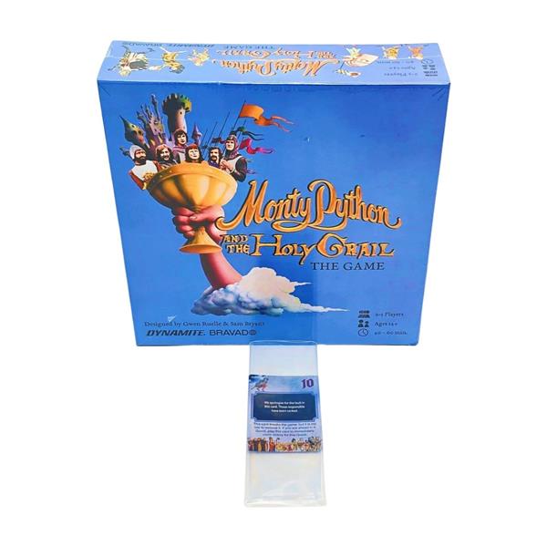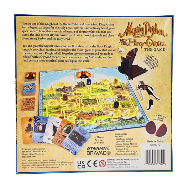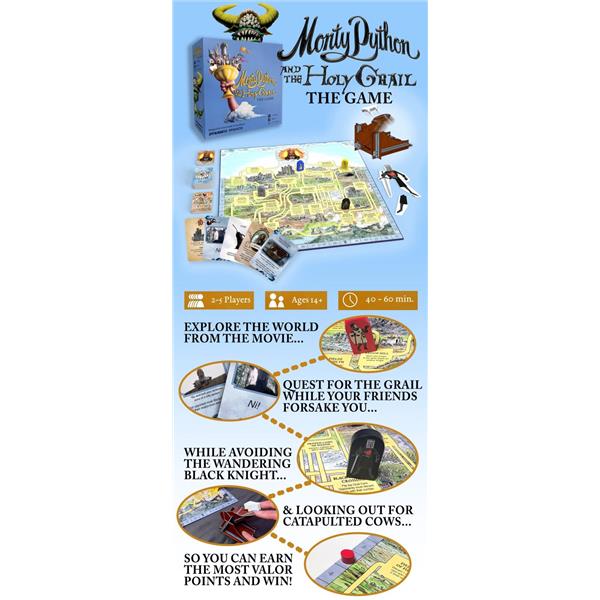 Play as King Arthur, Sir Lancelot, and the rest of the brave Knights on their Quest for the Holy Grail! Players travel a twisty maze of paths to visit the many absurd and memorable locations they saw in that one movie, all while avoiding the Black Knight who stalks the Players across the board. Each location has its own unique purpose that will bring the Players one step closer to earning the Valor points they need to find the Holy Grail first, but your fellow Knights won’t make it easy when they band together to hurl insults and sabotage your Quest. And just when you think you’ve got it all figured out, another Player catapults a cow at you and you’re suddenly left reevaluating your life choices. Everyone’s a “frenemy” in this official play-at-home adaptation of the cult classic movie the New York Times once called “a marvelously particular kind of lunatic endeavor”.