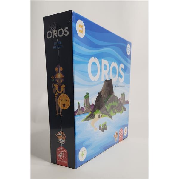 Oros is a tile-colliding, volcano erupting, mountain-making, wisdom-gathering, action-economy strategy game. On individual player mats, players move their Followers between action spaces, allowing them to manipulate a shared environment like a giant puzzle of plate tectonics. Action spaces allow players to shift rows of land, move and collide land tiles, form and erupt volcanoes, worship to gain wisdom, journey their Followers around the ever-shifting landscape, and build sacred places of study and worship on mountains. Building sacred places and worshipping in sacred places brings wisdom which is used to improve the abilities available for each action space. Wisdom is also used to improve the end game value of each sacred place built as well as reach other goals worth end game points.