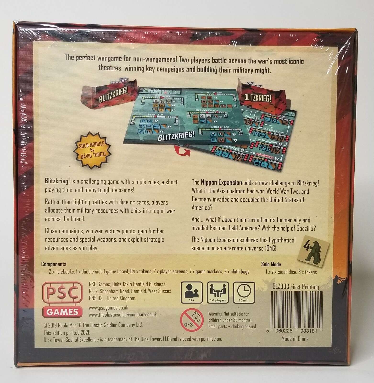 Also included is the Nippon Expansion, which adds a new challenge to Blitzkrieg! What if the Axis coalition had won World War II and Germany invaded and occupied the USA? And... what if Japan then turned on its former ally and invaded German-held America? With the help of Godzilla?