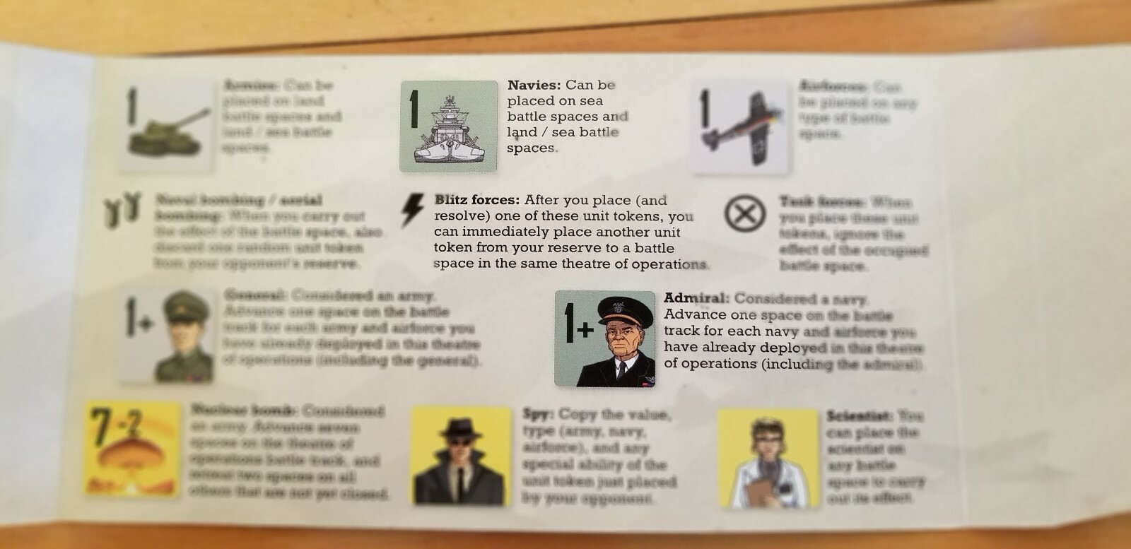 Players draw army tokens from a bag to determine their starting forces and to replenish their losses. Rather than 'fighting' battles with dice or cards, players allocate their military resources to each theatre's campaigns, winning victory points, further resources, special weapons, and strategic advantages as they play. Refight World War Two several times in one evening!