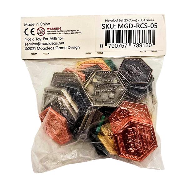Rail Coins are the first hexagonal metal coins specifically designed for upgrading your board game experience. Each coin also features a detailed engraving of a historic locomotive from the past. Wooden Treasure Chests of 3 different sizes that can double as coin trays are also available!