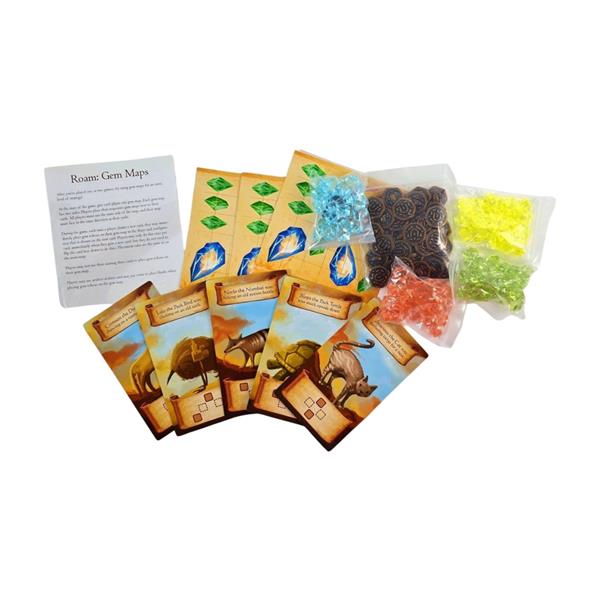 In Roam, you and up to three friends compete to find lost adventurers. The game includes more than fifty unique, tarot-sized adventurer cards, which feature characters from Near and Far, Above and Below, and Islebound. The opposite side of each card depicts a landscape split into six squares, and two rows of three of these cards are placed in the center of the playing area to make the board.