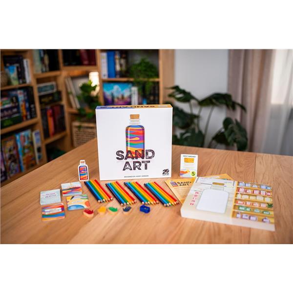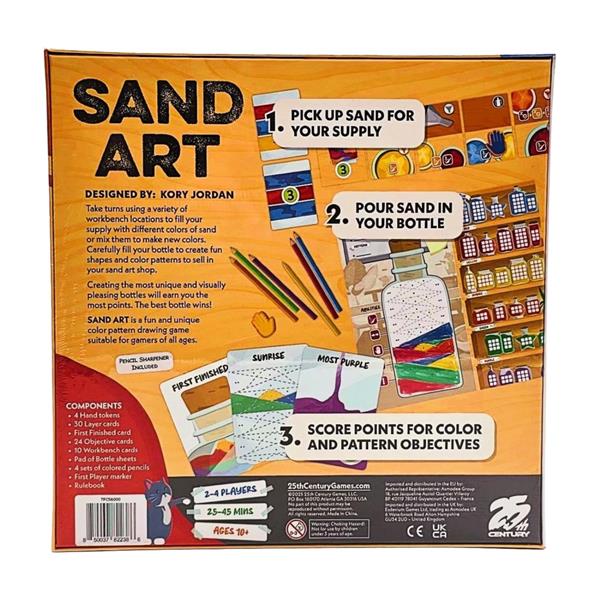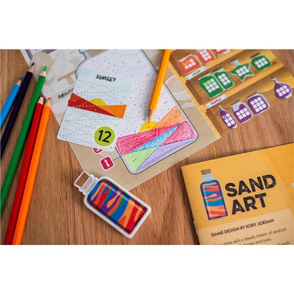Sand Art is a unique entry in the "___ & write" style of games. During play, you move back and forth along a linear track of actions on the workbench, gathering different colors of sand in your supply, mixing primary colors of sand into new secondary colors, and pouring them into bottles to create patterns and images that will attract customers in your shop. Creating the most unique and visually pleasing bottles will earn you the most points.