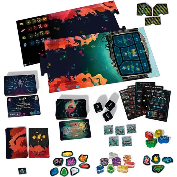 The Miner wins instantly by collecting all eight different crystals, and the Beast wins instantly by digesting the Miner after the attack of four bacteria of the same type. Of course, there's always the possibility that the Miner will simply pass through the Beast's system, in which case the player with the most points wins!