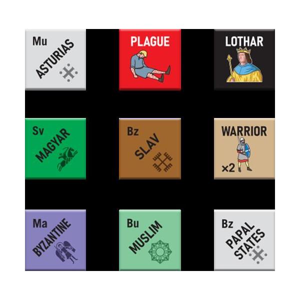 Carolingian Twilight: Decline of an Empire AD814 is a two to six-player game covering the decline of the Carolingian Empire following the death of Charlemagne (Charles the Great) in AD 814. The Salic Law of the Franks required that at a man’s death, his property was divided among all his sons, which led to civil wars among Charlemagne’s descendants when the inheritance in question was the Empire itself. From the various wills, wars and treaties dividing and redistributing the Empire during the 800s, emerged the nuclei of the modern states of France, Germany, and Italy. Each scenario depicts the period following a particular division of the empire, with each player taking on the role of one of the heirs. The object of the game is to reunite the Empire under a single ruler, while fending off not only fraternal Frankish rivals, but also the hostile surrounding foreign powers. Each game turn represents 1 year. The map scale is one inch to 75 miles. Each area is an historical region. Each unit represents 100-5,000 soldiers (plus camp followers, etc.).