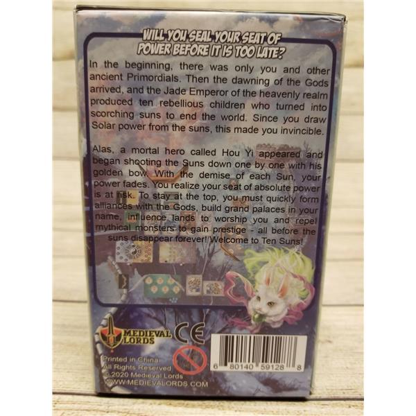 Alas, a mortal hero called Hou Yi appeared and began shooting the Suns down one by one with his golden bow. With the demise of each Sun, your power fades. You realize your seat of absolute power is at risk. In order to stay at the top, you must quickly form alliances with the Gods, build grand palaces in your name, influence lands to worship you and repel mythical monsters to gain prestige - all before the suns disappear forever! Welcome to Ten Suns!
