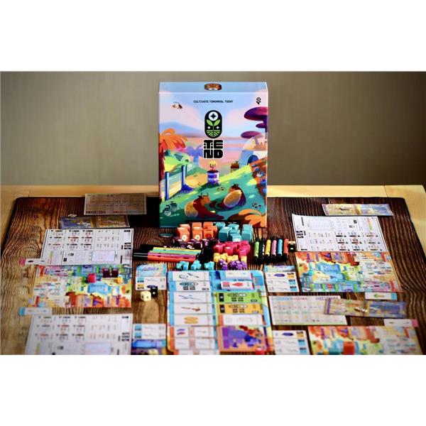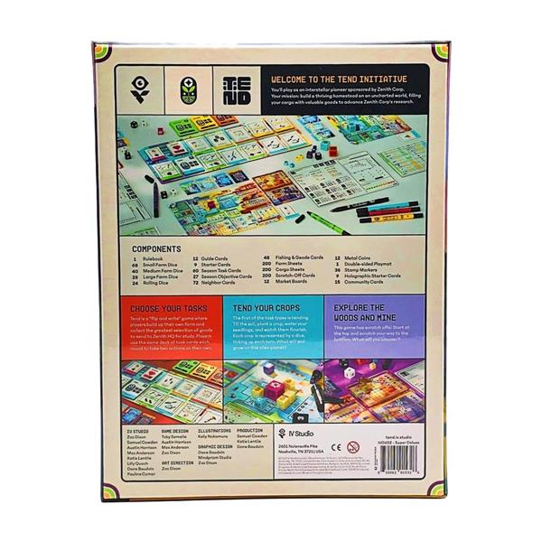 Tend is a "flip and write" game where players are each building up their own farm and collecting the greatest selection of goods to send back to Zenith HQ for study. All players will be using the same deck of action cards each round to simultaneously take actions on their own sheets.