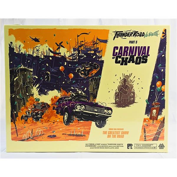 Carnival of Chaos is an expansion for Thunder Road: Vendetta (or Thunder Road: Vendetta – Maximum Chrome) that offers a new way to play. Players race their cars into the arena, collecting wild party favors, powerful super-weapons, and precious scrap along the way. This expansion also includes a full set of vehicles and a dashboard, so you can play with a fifth player using this expansion or in the regular game.