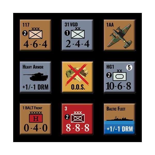 Each game turn represents 10 days. Each hexagon is 10 miles (15 kilometers) from side to opposite side. Units are corps, divisions, brigades or equivalents, and specialized smaller units. 22 x 34-inch game map 176 5/8-inch counters.