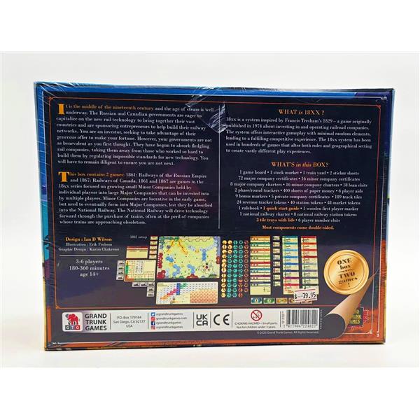 In 2005, Ian D. Wilson released 1861: Railways of the Russian Empire inspired by the railway development of Russia. In 2015, he released 1867: Railways of Canada, which is a standalone game that uses 1861's core rules on a different map with a handful of variations to gameplay. Both are classic examples of the versatile 18xx system of train games. They are straightforward enough to be your 1st 18xx game while still offering the depth you want in your 100th game.