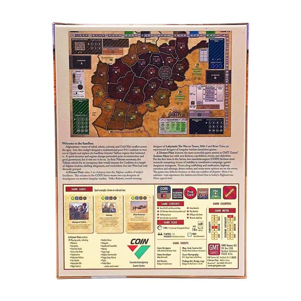 A Distant Plain features the same accessible game system as GMT's recent Andean Abyss and upcoming Cuba Libre but with new factions, capabilities, events, and objectives. For the first time in the Series, two counterinsurgent (COIN) factions must reconcile competing visions for Afghanistan in order to coordinate a campaign against a dangerous twin insurgency.