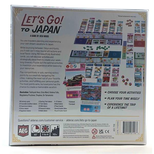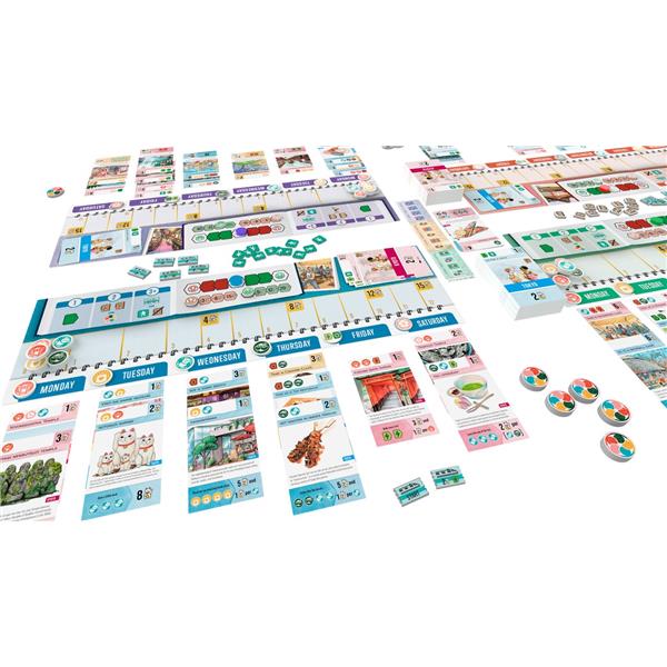 The game consists of thirteen rounds in which players draw activity cards illustrated by Japan-based artists and strategically place them in different days in their week-long itinerary. These can't-miss tourist attractions will have you bouncing between Tokyo and Kyoto as you try to puzzle out the optimal activities to maximize your experience while balancing your resources. The game ends with a final round in which you ultimately go on your planned trip, activating each of your cards in order along the way.