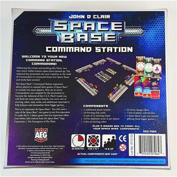 The Space Base: Command Station expansion allows players to expand their games of Space Base to include two more players and adds "pre-deployed" ship cards to adjust for balance and gameplay with more than five players. Now six or seven Commodores can compete for the promotion to become the Admiral of the U.E.S. Fleet!