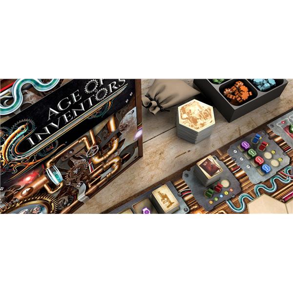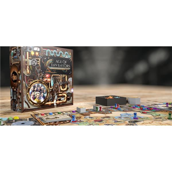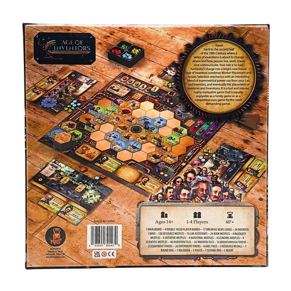 Age of Inventors combines Worker Placement and Action Selection mechanics with an interesting blend of asymmetrical power use from your Lab and Inventors, and eventually tile placement of Inventors and Inventions. It is a fast and intense, highly replayable game that is equally enjoyable as a family game or as a competitive euro game for the most demanding gamer.