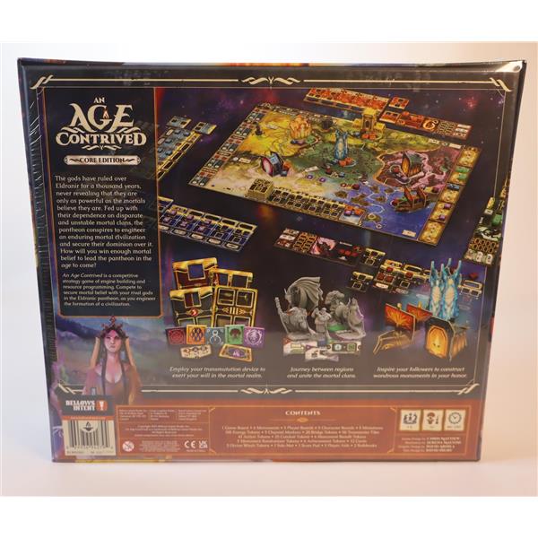 An Age Contrived is a fantasy euro game of engine building and resource programming. You play as a god in the Eldranic pantheon, where you are only as powerful as the mortals of this unstable world believe you are. Your goal is to establish yourself as the pantheon's prevailing god by securing mortal belief, as you advance the mortal realm from its age of darkness into civilization.