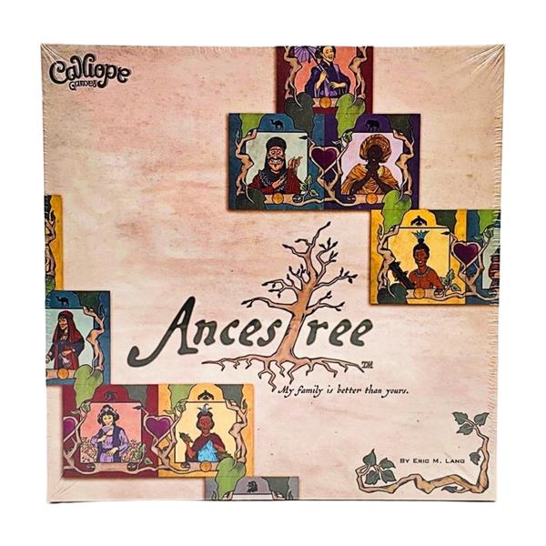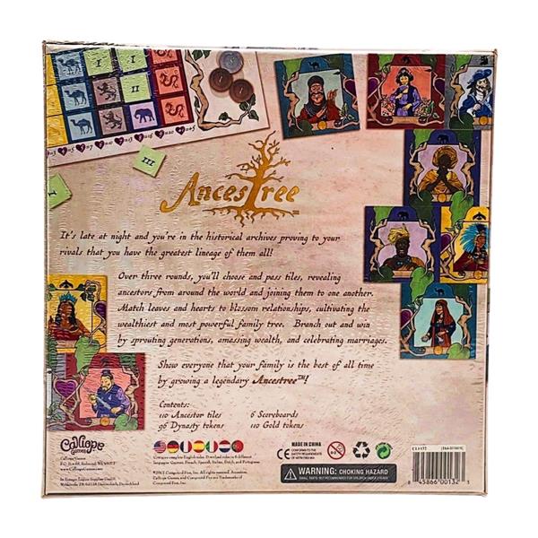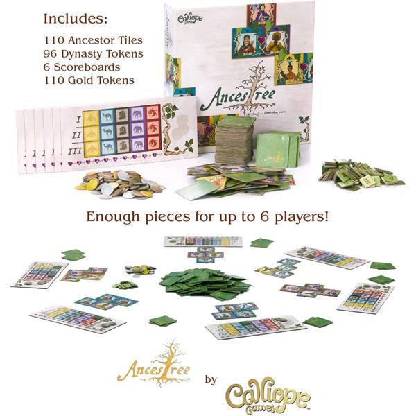 In the tile-laying game Ancestree, players get to build their personal family trees! During each of three rounds, every player begins with a hand of six ancestor tiles. They choose one and pass the remaining tiles to the next player. The chosen ancestor is then added to the family tree, connected by leaves or hearts. Once five ancestor tiles have been added to the tree, the round ends. Players compare their family tree to those of their neighbors and gain points for the longest connected generations and for coin icons in their tree.