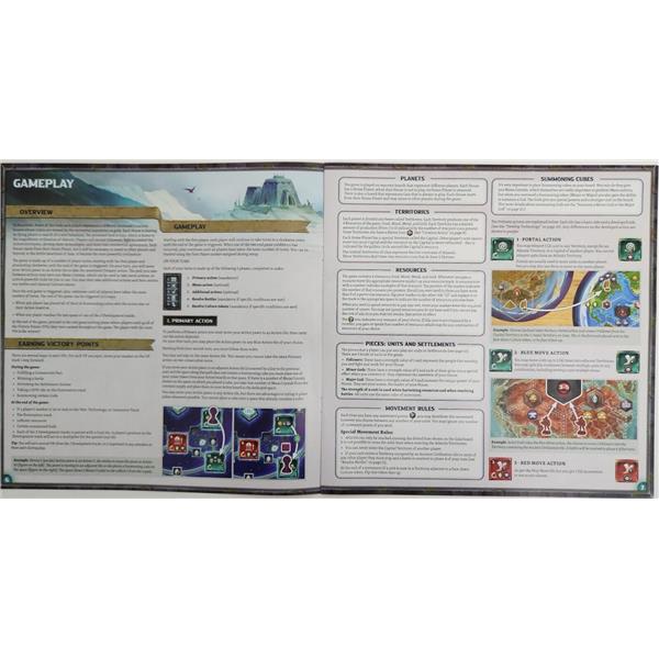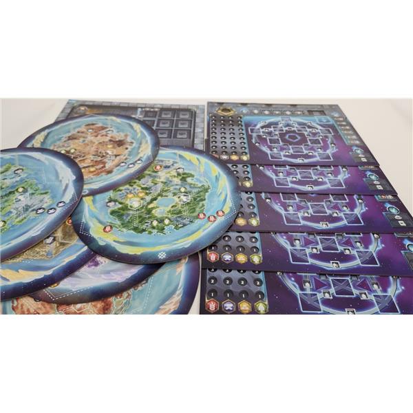 In addition to having a strong dose of controllability (the luck factor is minimal), the game features an innovative starred action-selection-system that confronts players with interesting choices: players can reincarnate their gods by performing their actions in a precise sequence, on pre-established paths of their starred player board, or they can give up some deities, jumping freely from one action to another of their board, to choose from time to time the situationally best actions.