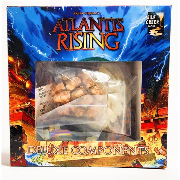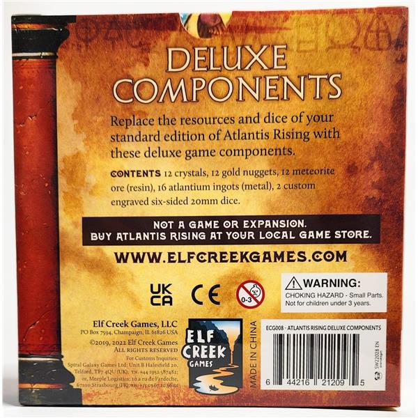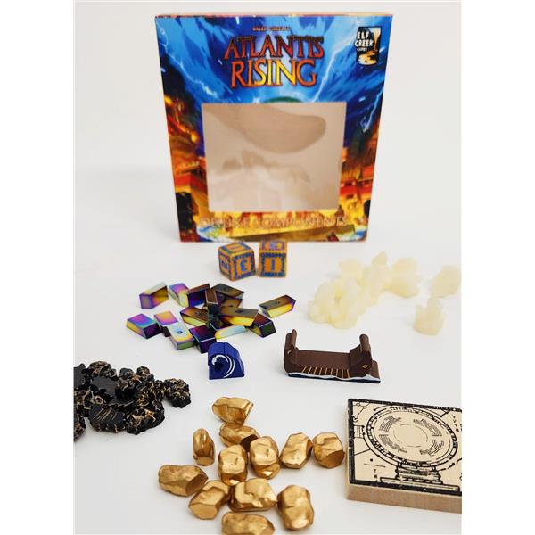 Enhance the look and feel of your copy of Atlantis Rising with these jaw-dropping component upgrades. The upgrade replaces the acrylic gems with uniquely shaped resin and metal resources and includes new wooden pieces and thematic, engraved dice. These deluxe components are a wonder to behold!