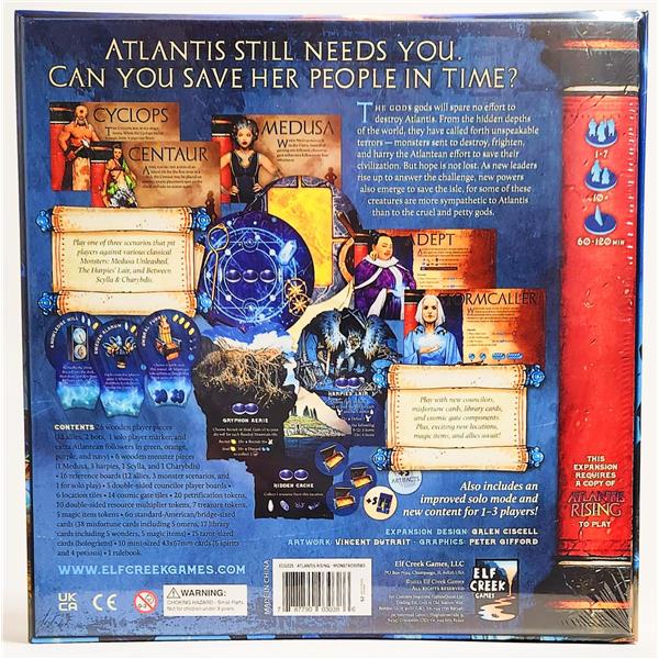 Atlantis Rising: Monstrosities is an expansion for Atlantis Rising that offers three new scenarios for play: Medusa Unleashed, The Harpies’ Lair, and Between Scylla & Charybdis. Players will find new content for every aspect of Atlantis Rising, from new misfortunes & councilors to four new mechanisms: monsters, allies, magic items, and locations. Also includes a new and improved solo mode.