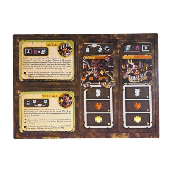 You have a personal action space. When it is your turn, during the Action Phase, you can place 1 Engineer on this space to produce an amount of energy equal to the number of Water Drops currently held in your Dams. You can't add any bonus to this production, but you can use it to fulfill a Contract. The Water Drops stay where they are after this action.